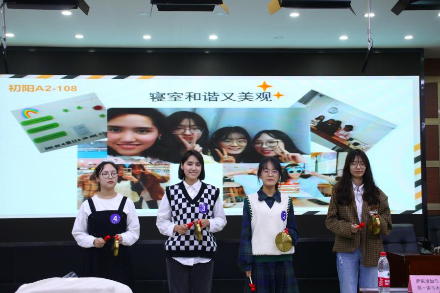 本次比赛共有五支优秀的寝室队伍经过层层选拔,来到了决赛的现场,而这些寝室队伍将通过两个环节来角逐出最终名次。第一环节是“小组风采展示及自我介绍”,第二环节是“小组成果展示及评委提问”;各参赛寝室按照抽签顺序依次上台展示寝室风采以及打卡成果,展现各自的寝室特色。
