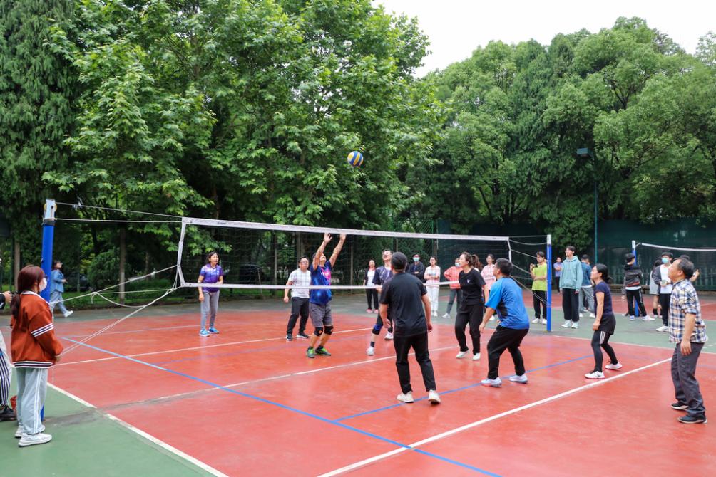 下午两点不到,两个学院的教师们就早早来到了排球场上进行热身与锻炼。为他们加油打气的老师们和同学们也陆续到场,场上气氛渐渐热烈了起来。随着裁判一声哨响,比赛正式开始!