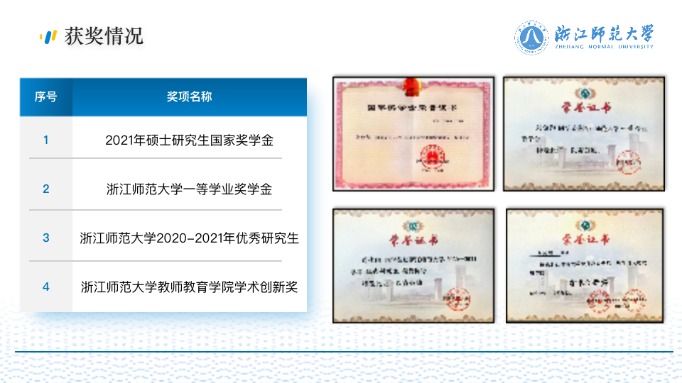 陈怡,教育技术学专业2018级本科生,现已保研至华东师范大学。本科期间,连续三年综合评价、发展评价、能力评价等多项指标位列专业第一,曾获国家奖学金、浙江省政府奖学金,全国计算机大赛二等奖、省电商大赛一等奖等90余奖项,其中省级以上近20项。